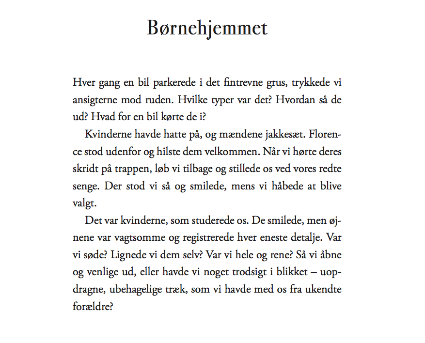 Jeg vidste tidligt, at jeg aldrig ville blive adopteret. Jeg er født med en misdannelse. De kvinder, der kom for at vælge et barn, veg tilbage, når de så mig. Så tog de sig sammen, lagde hovedet på skrå og smilede medlidende. Derefter valgte de hurtigt en, der var yngre, som så sødere ud og var helt normal. Det var, som om det blev lettere for dem at vælge, efter at de havde set mig. Hvem som helst, bare ikke hende.