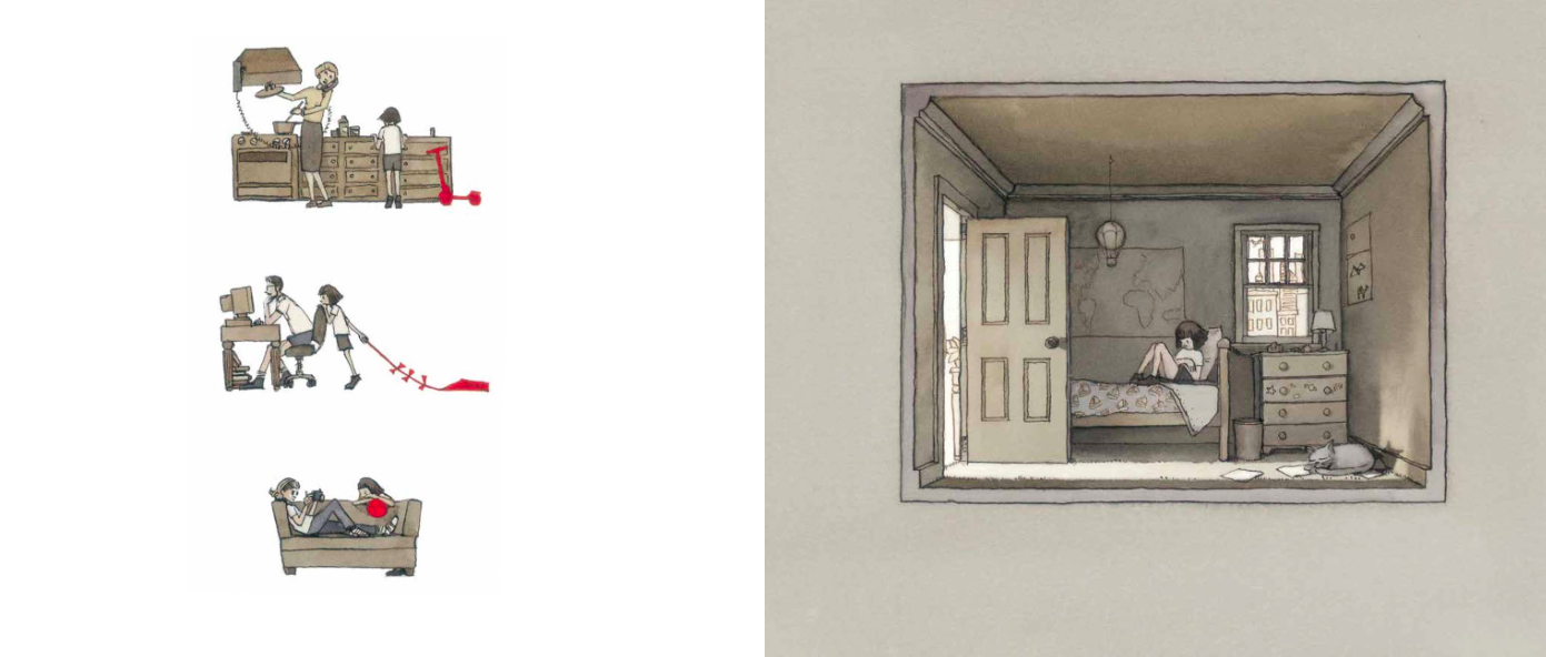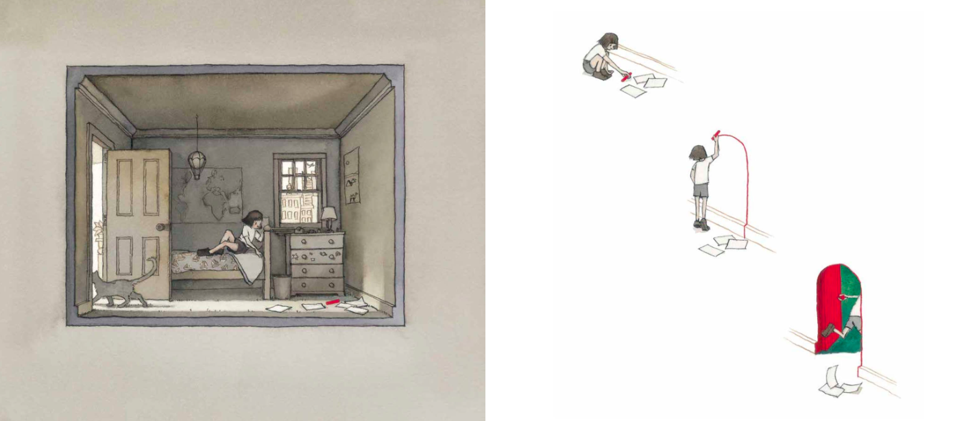 Tag med den ensomme pige på en ordløs rejse, bort fra en grå-brun fantasiforladt hverdag. Hendes eneste følgesvend er en rød farveblyant, som åbner døren ind til en anderledes farverig og magisk parallelverden…