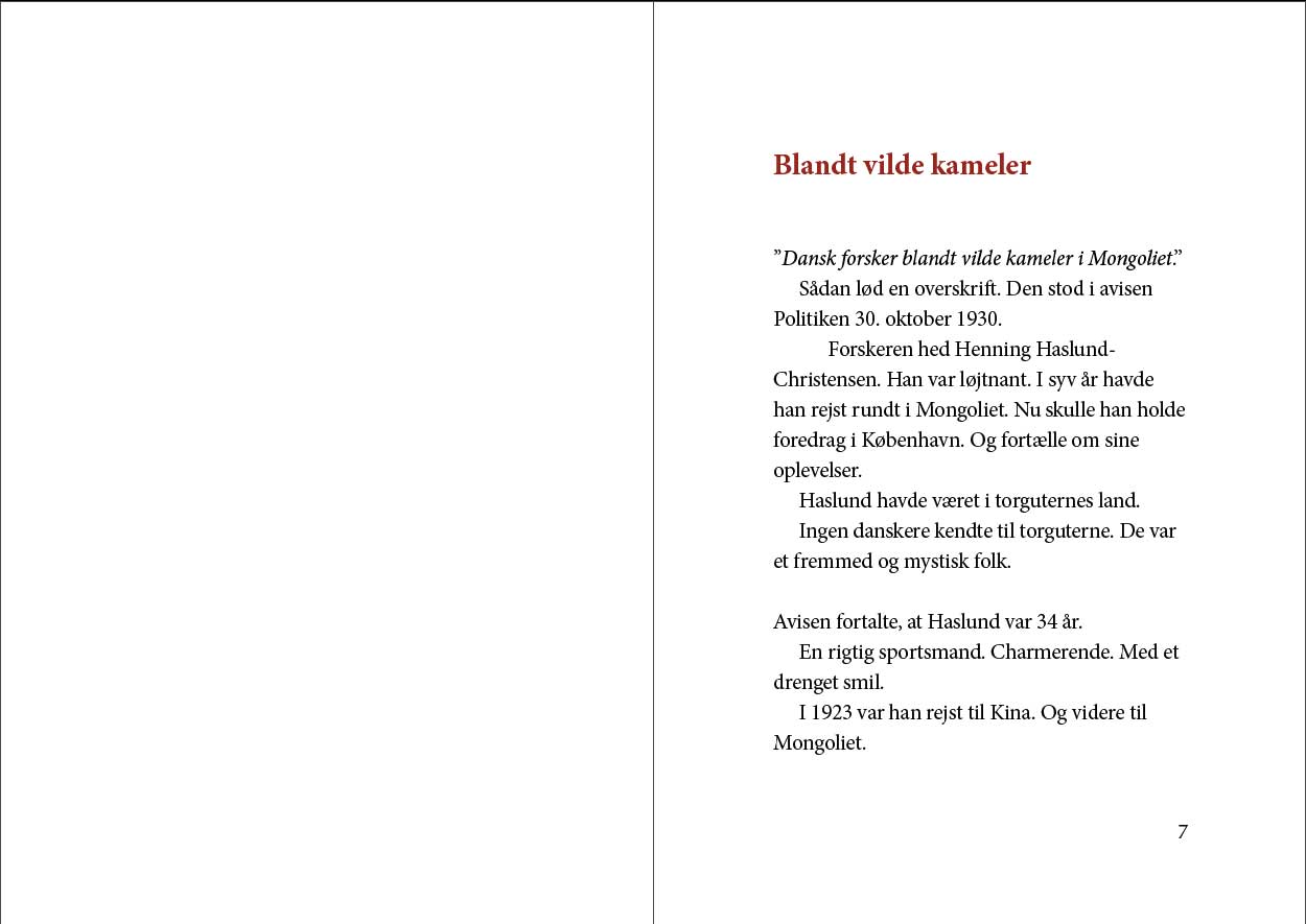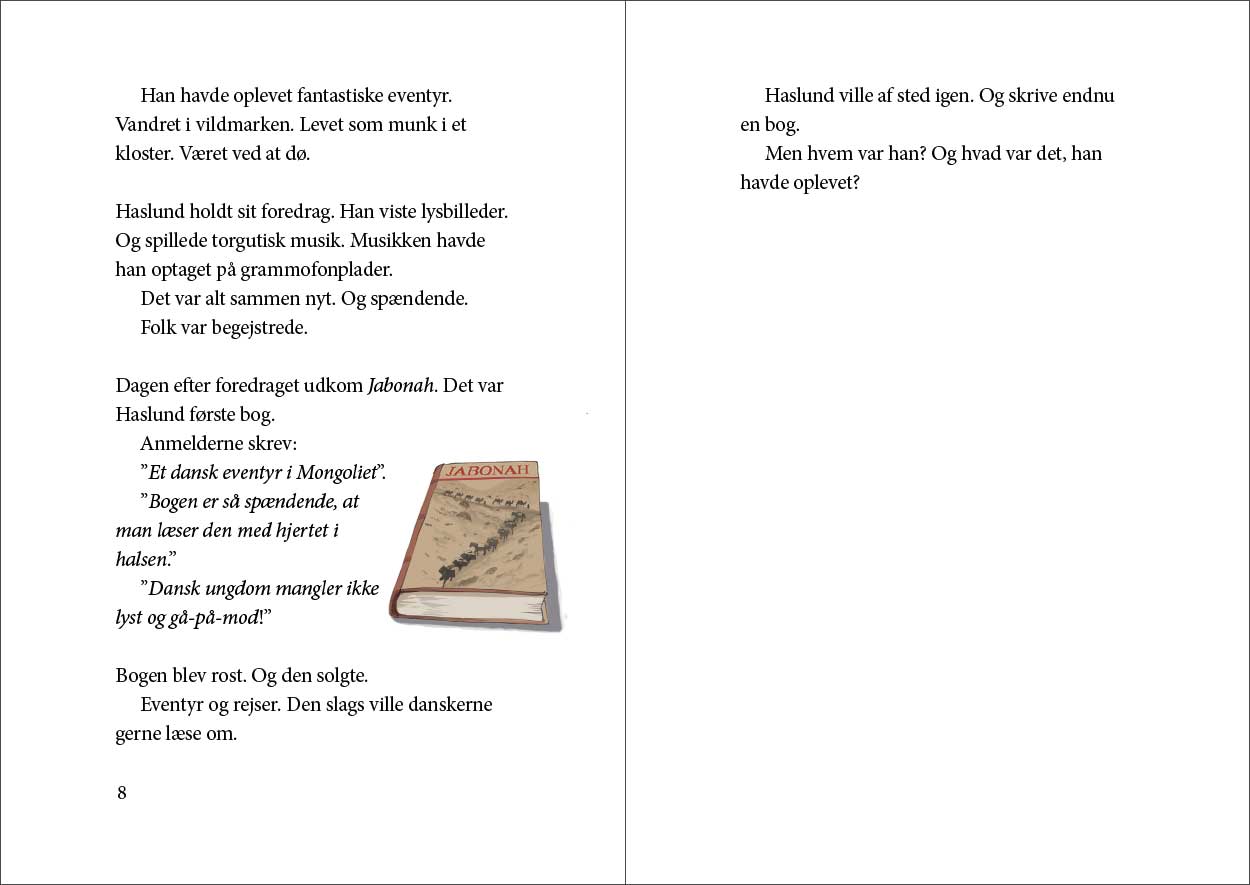 Henning Haslund Christensen – Danmarks sidste opdagelsesrejsende – var en eventyrer. Som dreng ville han ud i verden og kom på spændende rejser gennem Mongoliet. Bogen fortæller om den 8 måneder lange og hårde rejse, hvor gruppens hestevogn går gennem isen, og der er snestorm. På grænsen til Rusland bliver Haslund fanget af soldater og dømt til døden, men han bliver reddet af en løgn. Følg med på kamelryg gennem Gobi-ørkenen. Kom på besøg i en spøgelsesby.